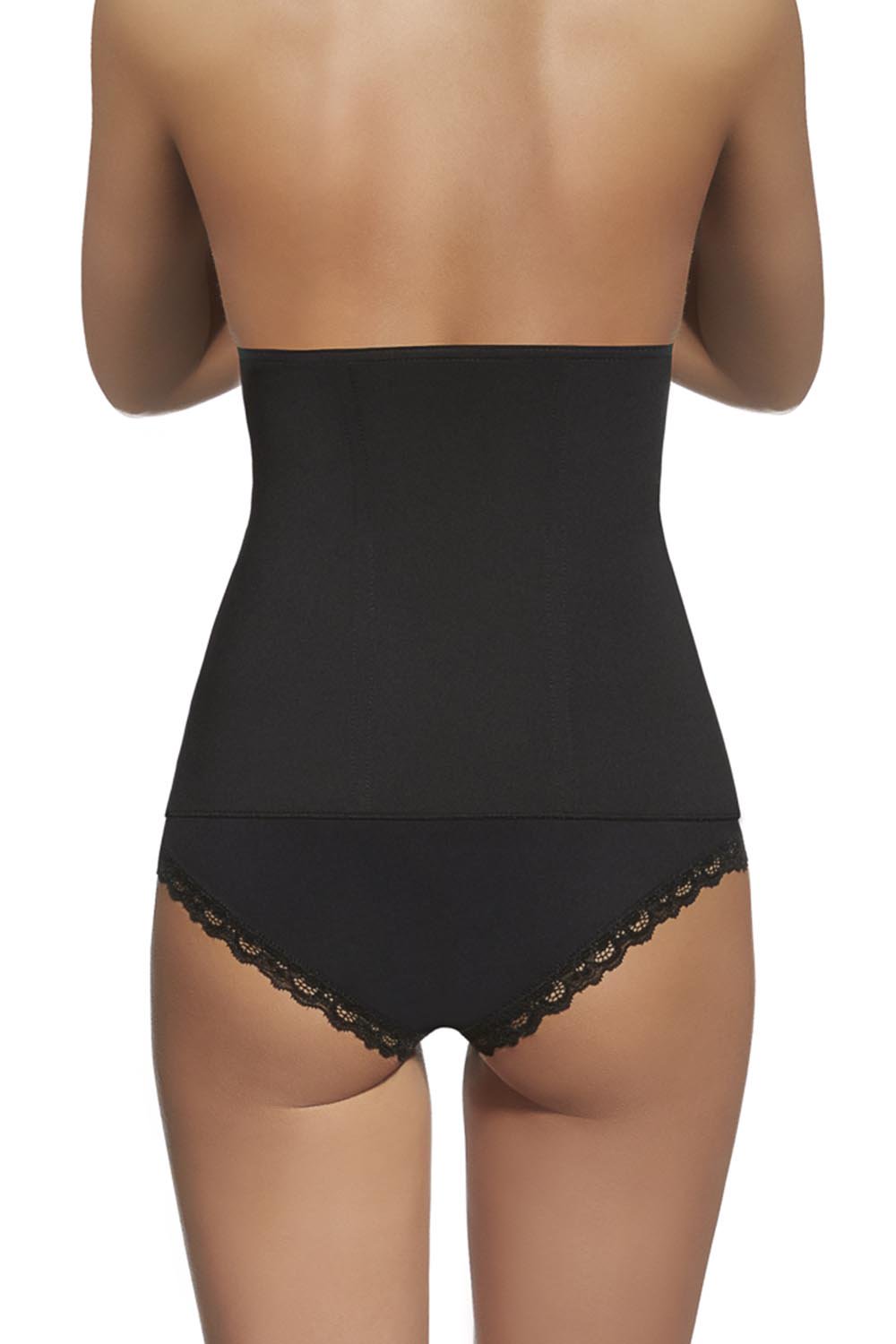 Pas wykonany jest z grubszej, obciskającej, gumowanej dzianiny, dzięki której zawsze pozostaje na swoim miejscu zwiększając tym samym komfort noszenia. Z przodu zapięcie na haftki. Model posiada 6 metalowych fiszbin.